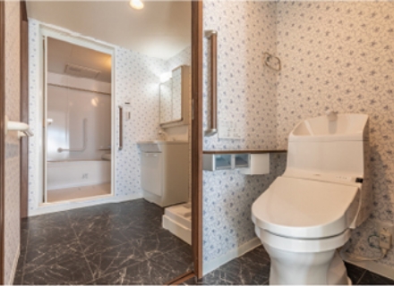 ■お身体の状況が変わっても住み続けられるように洋室・トイレ・脱衣室・浴室まで一直線に移動できるようにし、また2ウェイ動線を採用しました。